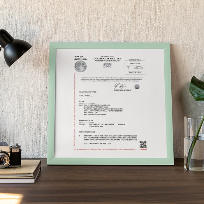These official documents & images are sent to your email where you can print as you desire. All documents are provided in English only in compliance with international treaties. The land on the Moon is governed by the Outer Space Treaty of 1967 therefore this land is sold as a novel souvenir.